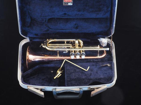 Conn Director w/ Coprion Bell Cornet, Used . Vintage to 1963. Coprion brass bell. Lacquer 100%, one small dent on first valve exit tubing at curve, very clean and nice for its age. Chem cleaned, no finish loss. Plays beautifully. Includes original